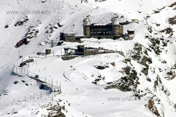 At the most eastern side of Zermatt, already two big glaciers fall into the deep at the right and the left side of the Monte-Rosa mountain: at the left of the Monte-Rosa-Group, the Findelen Glacier and at the right of it the Gorner Glacier. Between these two glaciers, a long extended mountain ridge arises up to the Stockhorn; further above, the ridge then completely disappears under the glacial ice. This ridge is called Gornergrat and the legendary railway that conquers this mountain from Zermatt is called Gornergratbahn or also Gornergrat-Monte-Rosa-Bahn.