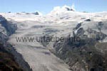 Right underneath the Matterhorn, Zermatt is visible. How tiny the little city seems to be from here above! Then a pan to the left and one looks up to the Cima di Jazzi. An impressive wide glacier surface, where the glacier is fed, gets into the Findelen Glacier and flows downstream. The Findelen Glacier is from above at least as impressive as the Gorner Glacier viewed form the Gornergrat.